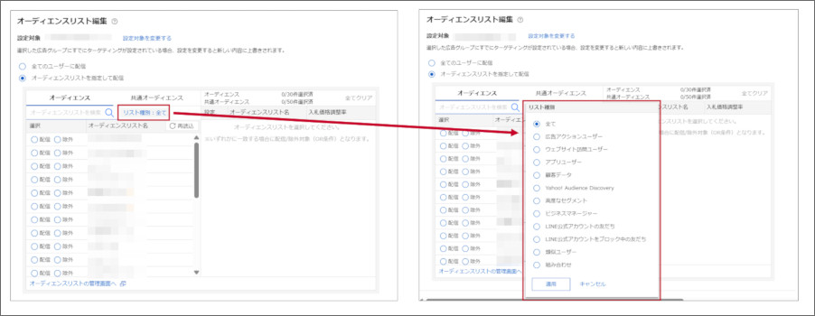 オーディエンスリスト選択時に「リスト種別」で絞り込みができるようになり、リスト編集も含む全体の操作画面が見やすく変更。